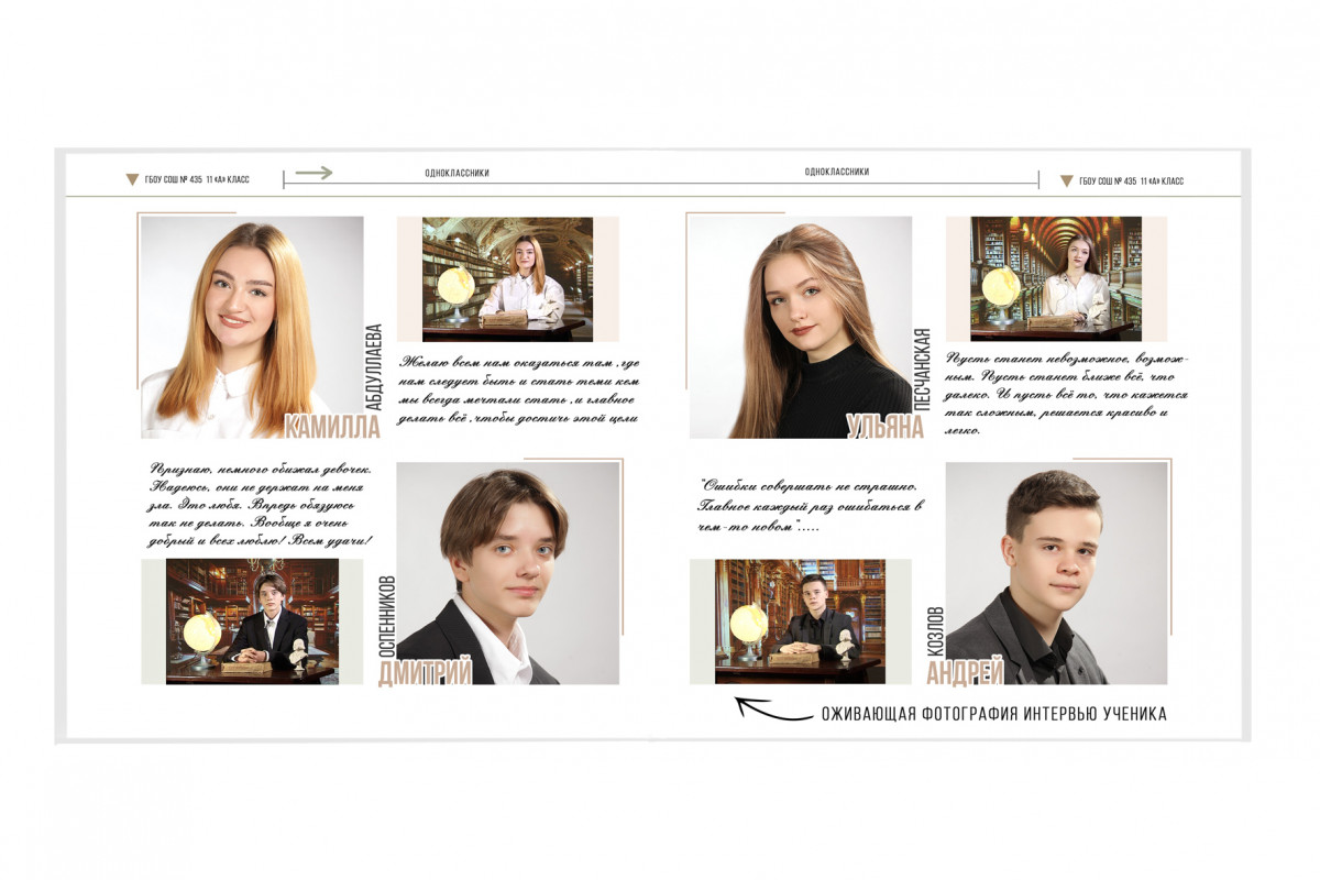 — Оживающие фотографии (интервью каждого ученика, интервью учителей, видеоролики общие)