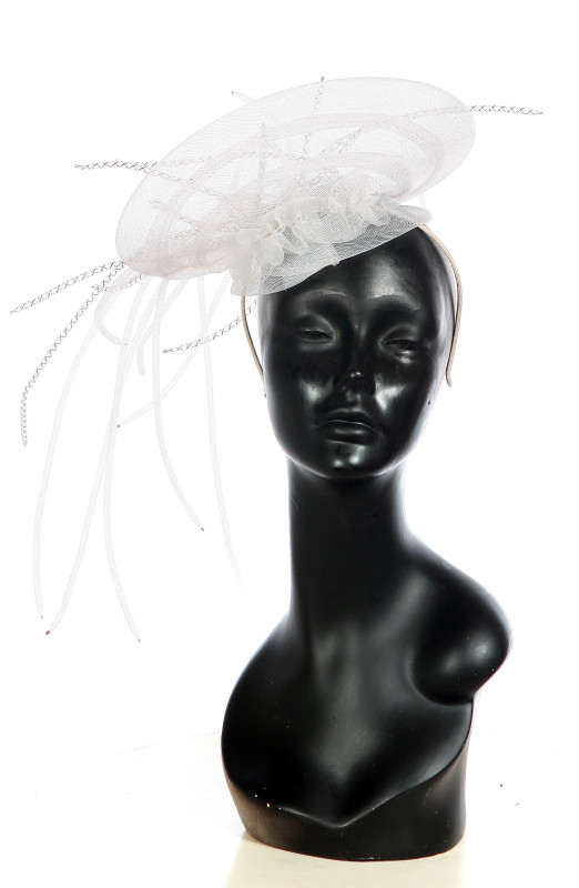 Женская коктейльная шляпка из кринолина белого цвета. На ободке. Стоимость аренды в студии 200 р. Стоимость аренды на два дня 500 р. Цена шляпки 3500 рублей.