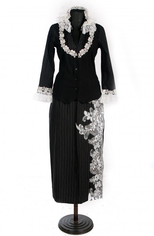 Костюм женский Шэр из коллекции "Круэлла" выполнен из габардина с эластаном.Украшен аппликацией и кружевом. Стоимость аренды в студии и на балу 550 р. Стоимость аренды на два дня 1500 р Цена костюма 20000 р.