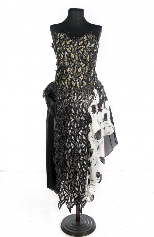 Платье из коллекции "Круэлла" на корсете. Выполнено из шелка, вышитого кружева и экокожи. Стоимость аренды в студии или на балу 550 рублей, стоимость аренды на два дня 1500 рублей. Цена платья