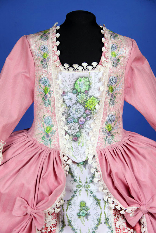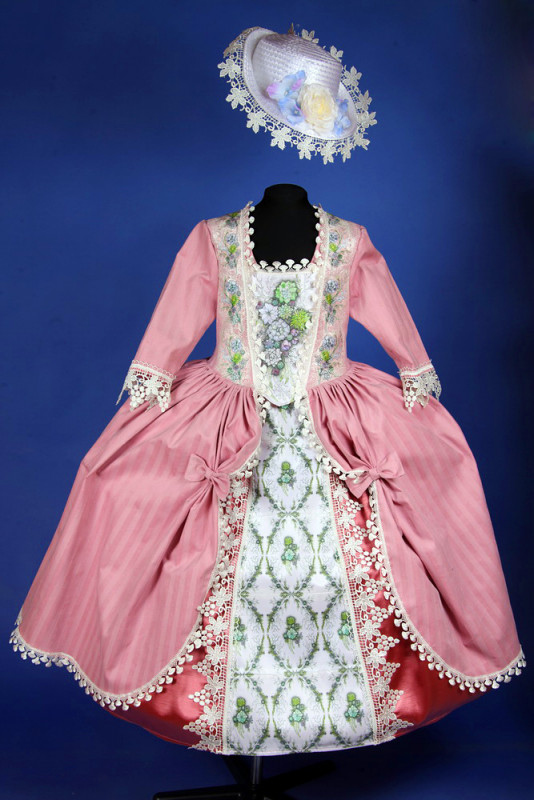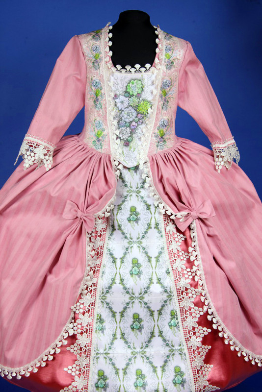 Платье из коллекции "Версальская роза",выполненное по образцам дворцовых костюмов Франции 18 века. Размер 140. Материал микровельвет тафта. Украшено авторской печатью по мотиавам вышивки 18 века, росписью и кружевом. Стоимость аренды 450 р. при условии использования в студии или на балу. Стоимость аренды на 2 дня 1500 руб. Цена платья 20 000.